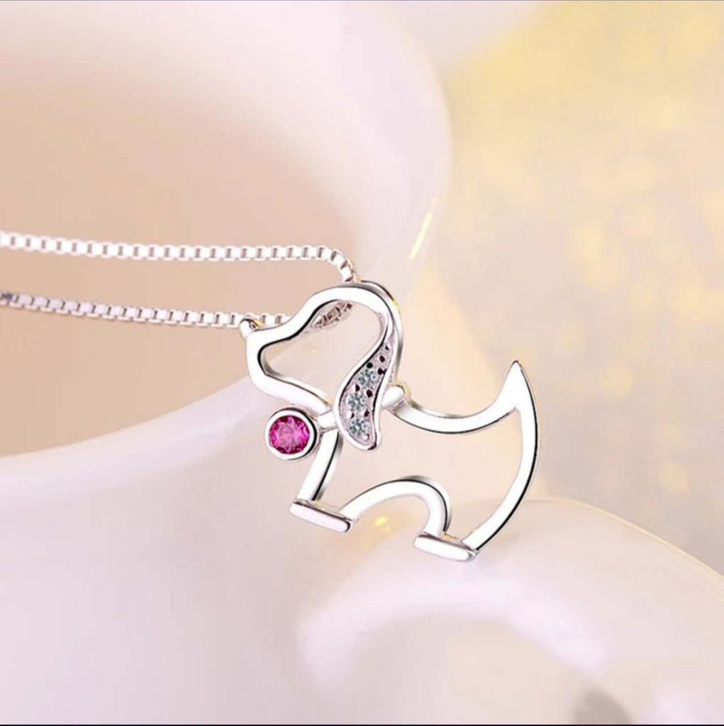 This cute dog pendant is perfect for those who are in love with dogs. It could be a perfect gift. It is set in 925 sterling silver over rodhium plated. The red stone is cubic zirconia. It is 15mm wide and 18mm long. Chain size is 18" inch long. Do not tarnish and is nickel free. In stock.