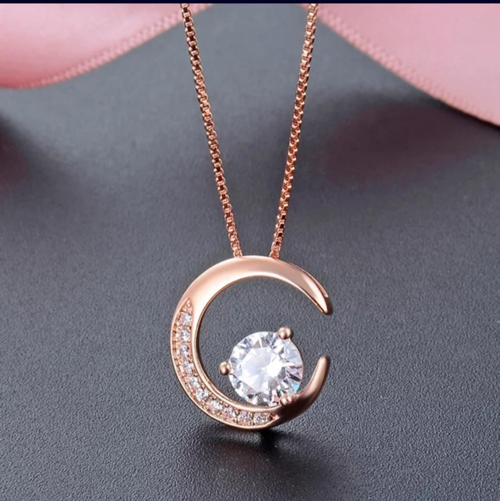 Beautiful half moon necklace to demonstrate your romantic side. The necklace is set in 925 sterling silver and rose gold. The middle stone is austria crystal. It comes with a 18" inch long necklace to make the perfect fit. Stone size is 6mm, it hasl 1 mm crystals on the side. Pendant size of 24.3 mm. The perfect necklace for a gift. The necklace comes in rose gold and silver.