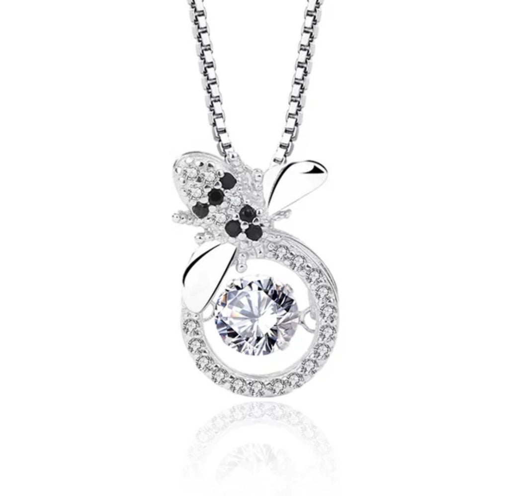 This necklace is set in 925 sterling silver. The gemstone are Austria crystals. The pendant size is 4mm. Chain size 16-18" inch long. The style is bee on top of the circle. It has crystal all around. Nickel free. In Stock.